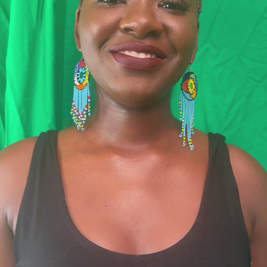 This pair is for you! Inspired by the traditional dreamcatcher, these blue beaded earrings are designed to capture and reflect your dreams and aspirations. The intricate beadwork forms a delicate web, adorned with small blue beads that catch the light beautifully, creating a mesmerizing effect. Despite their intricate design, these earrings are lightweight and comfortable to wear, making them perfect for any occasion.